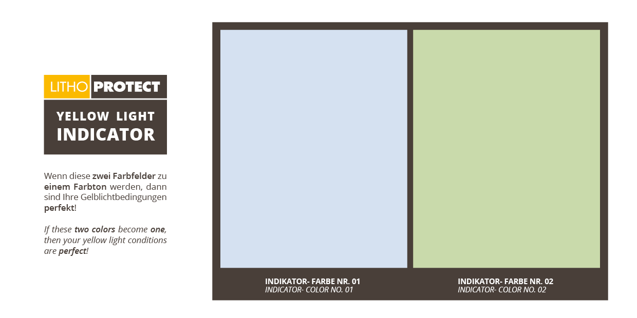 Wir haben einen einfachen Test entwickelt, mit dem Sie Ihre Gelblichtbedingungen überprüfen können. Nehmen Sie hierfür unsere Testkarte mit in Ihren Gelblichtraum und überprüfen Sie ob beide Indikatorfarben identisch aussehen. Erkennen Sie einen Unterschied zwischen den beiden Farbfeldern, könnte ein Problem mit Ihrem Gelblicht vorliegen und Sie sollten Ihre Gelblichtfilter wechseln. Gerne senden wir Ihnen für einen zweiten Test ein Muster unserer Lithoprotect® Gelblichtfilterfolie zu. Decken Sie für die zweite Testreihe eine gewöhnliche Schreibtischlampe mit der Test-Folie ab und schalten diese in einem dunklen Raum an. Bei Betrachtung unseres Gelblicht Indikators können Sie nun das sichtbare Ergebnis des so gefilterten Lithoprotect®-Lichts mit der Beleuchtung Ihres Gelbraums vergleichen.